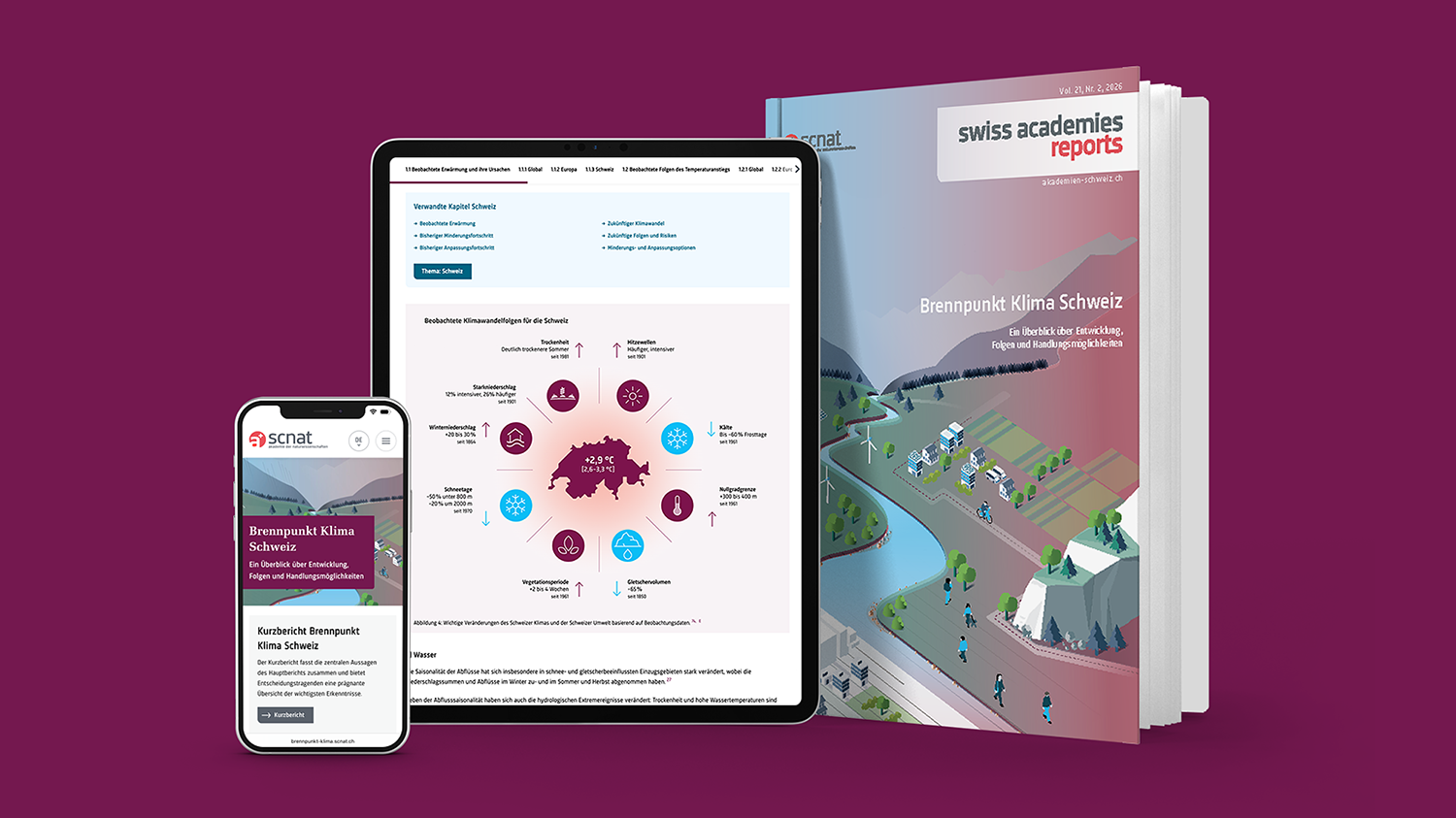 Cover-Visualisierung und Infodesign für den Report «Brennpunkt Klima Schweiz» mit den Erkenntnissen 60 Forschender.
