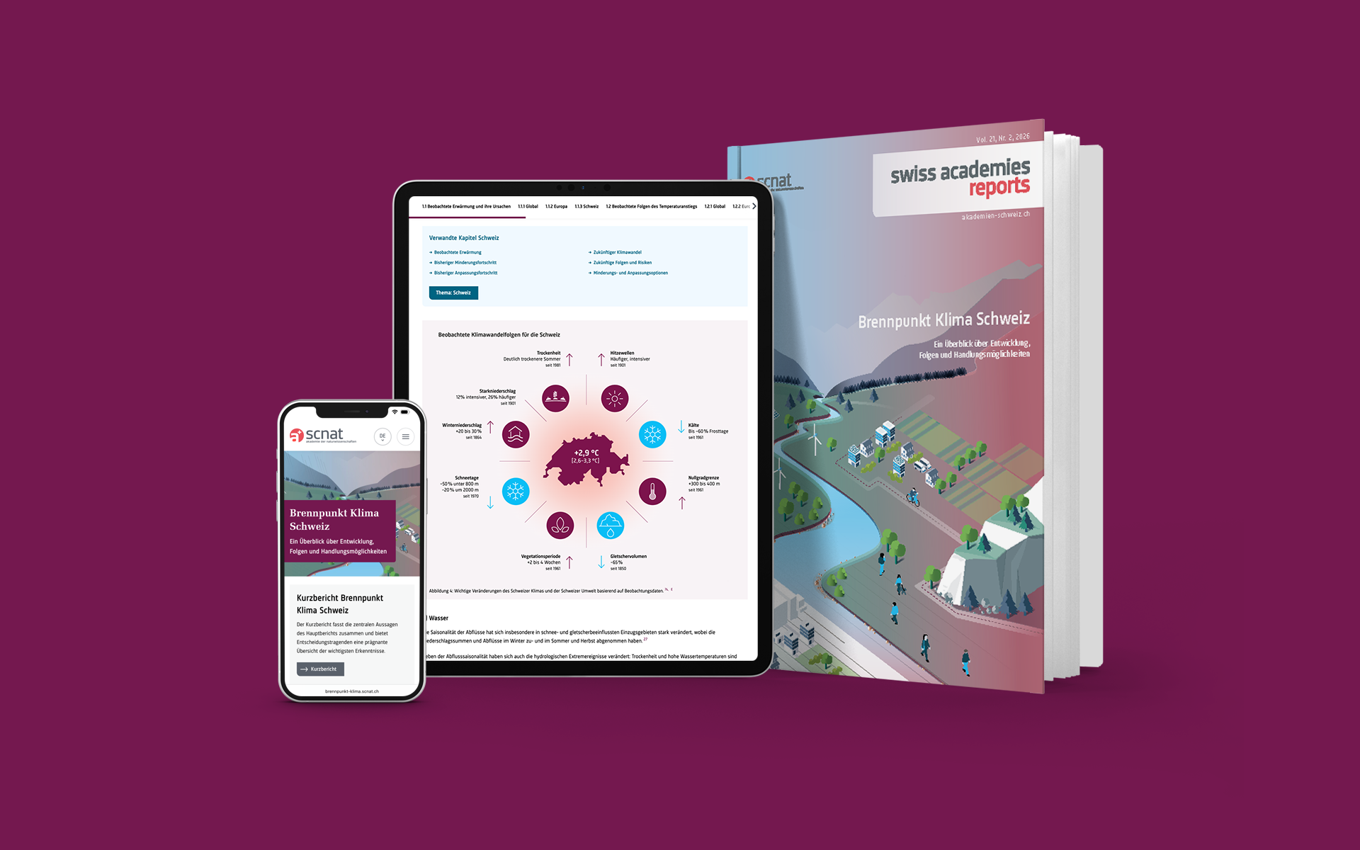 Cover-Visualisierung und alle wissenschaftliche Grafiken für den Report «Brennpunkt Klima Schweiz» mit den Erkenntnissen rund 60 Forschender.