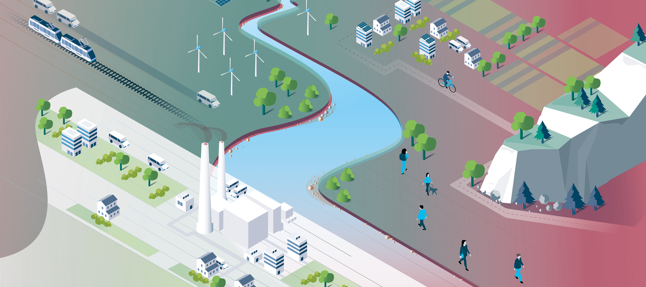 Das Keyvisual verbindet im Vordergrund Industrie und Bevölkerung, im Hintergrund die alpine Quelle, und verdichtet so den Gegensatz zwischen Eingriff und Ursprung.