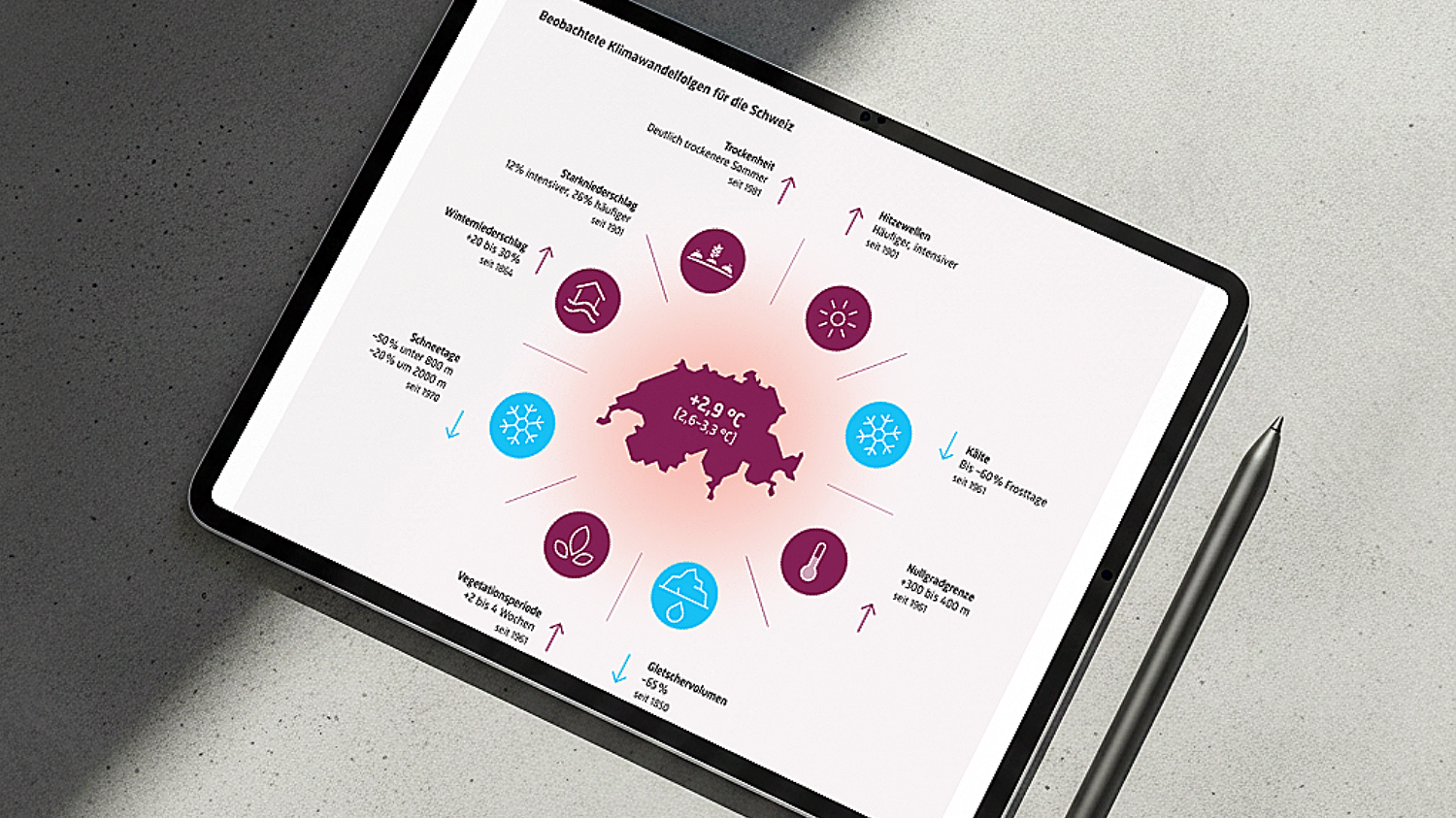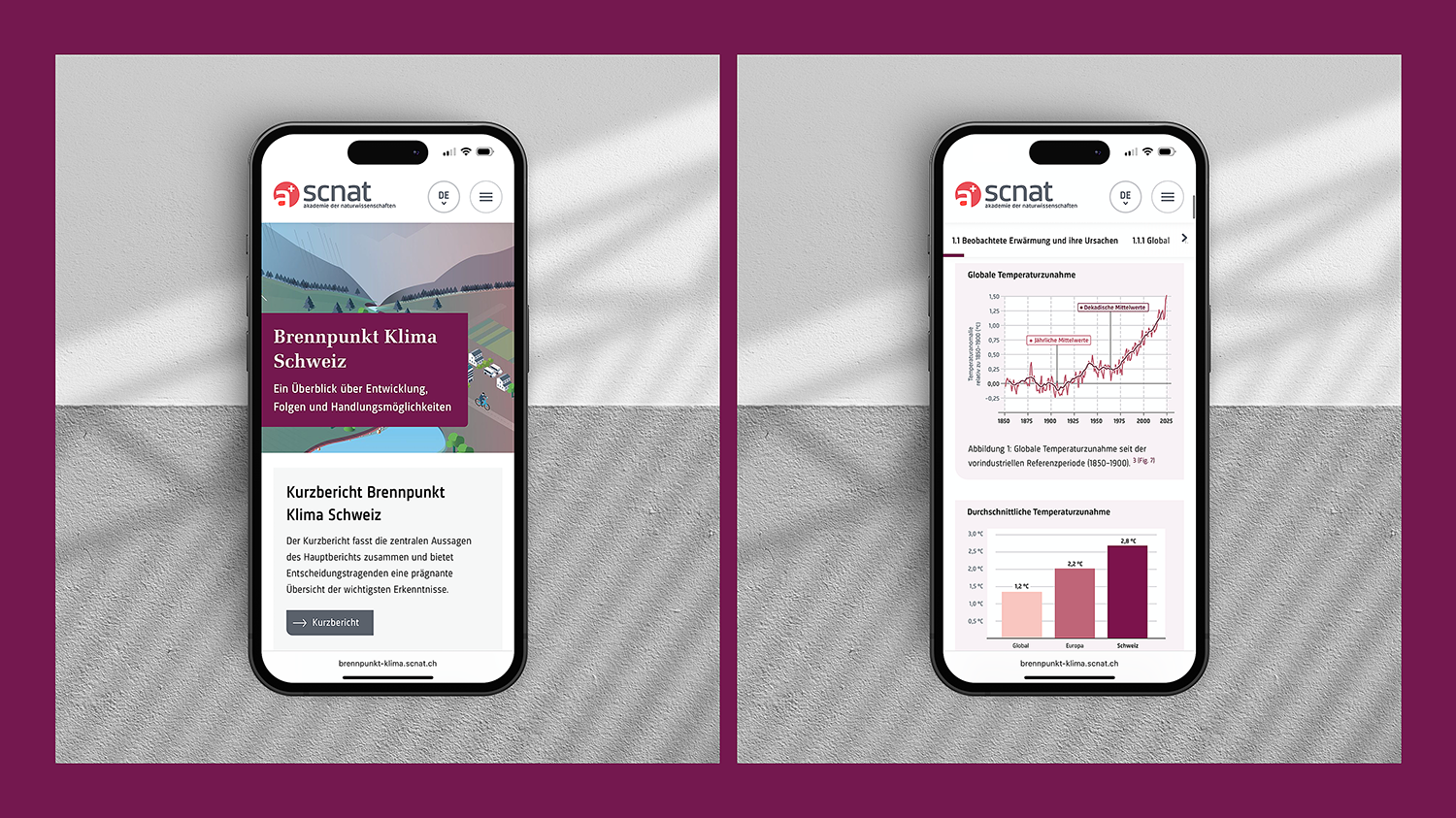 Für das Forum ProClim der Akademie der Naturwissenschaften Schweiz wurde ein visuelles Konzept für die Publikation «Brennpunkt Klima Schweiz» entwickelt, das Titelbild und Grafiken umfasst. Grundlage bildeten die Ergebnisse rund 60 Forschender. Ziel war es, die komplexen Inhalte klar und konsistent zu vermitteln.
